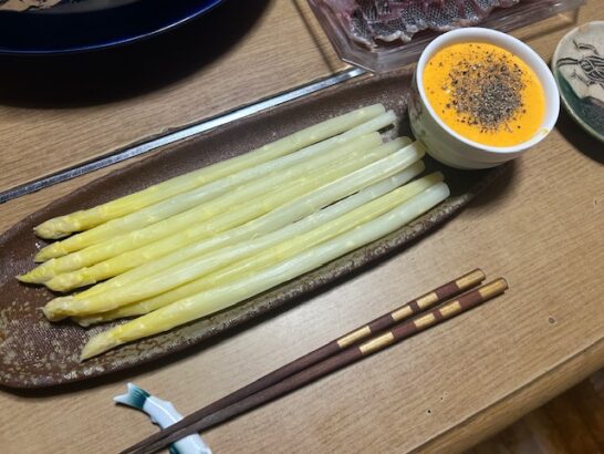 前日にホワイトアスパラガスを食べるために作ったオランデーズソースを使って、エッグベネディクト風に仕上げます。
